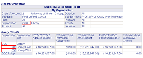 | Clicking the Organization code GQ0 from the previous page displays the next layer of the Organization Hierarchy report. Notice that you are still in the Organization section. Click here to view the hierarchy for the organization used in this query.