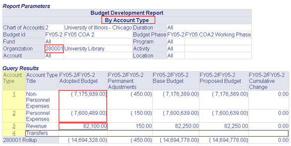 The Account Type section follows the Organization section, and it is always on one page. It shows the budget amounts grouped by account type for the Organization shown in the Report Parameters section. Scroll down to view the entire form, then click on a red-outlined section to view its description.