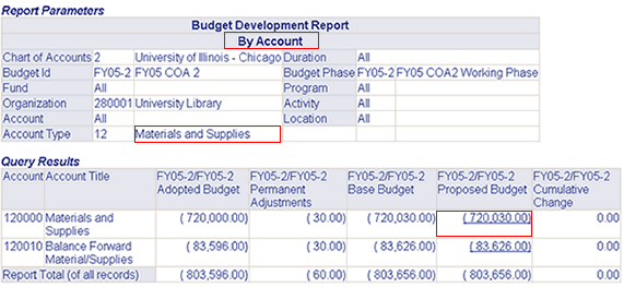 A summary of budget amounts By Account follows the summary by two-digit account type. This Account section shows all the accounts associated with the two-digit account type you clicked in the previous report page. Click on a red-outlined section to view its description.